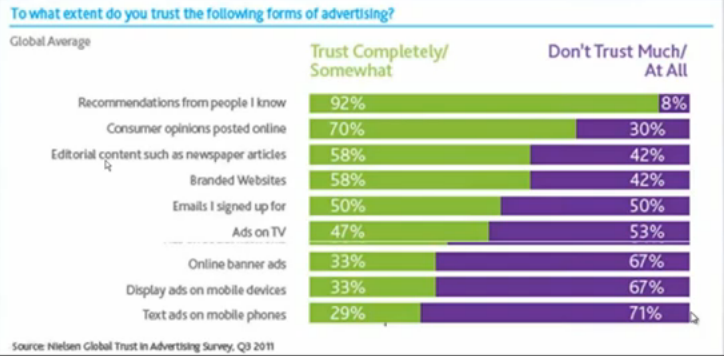 Now, that percentage is shocking! You can have the best reporter do a story on your company and people will not trust that as much as they trust recommendations from people they know or consumer opinions posted online.